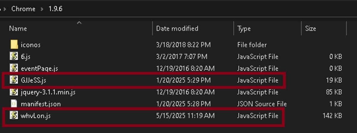 La Figura 1 muestra los archivos de la extensión maliciosa persistida en la máquina de una víctima.