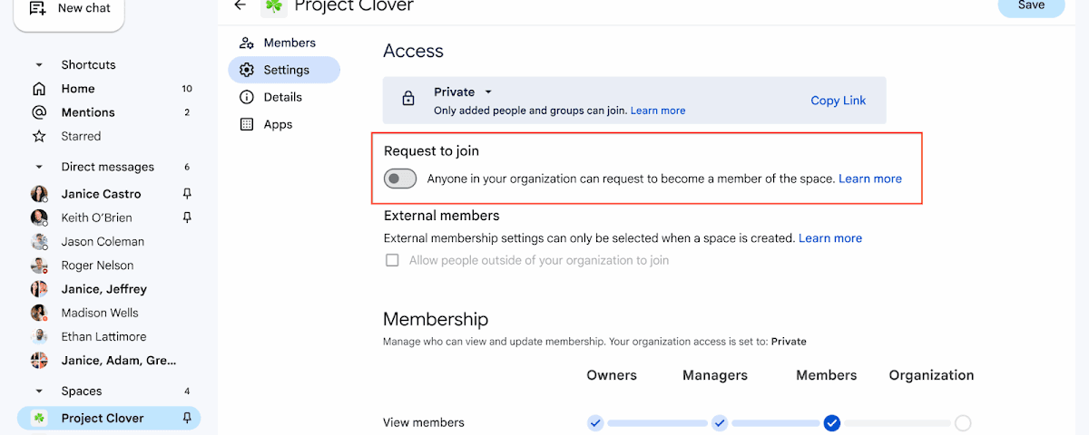 Estamos introduciendo una nueva configuración en Google Chat que permite a los propietarios y administradores de espacios controlar si los usuarios pueden solicitar unirse a un espacio.