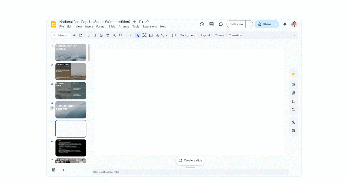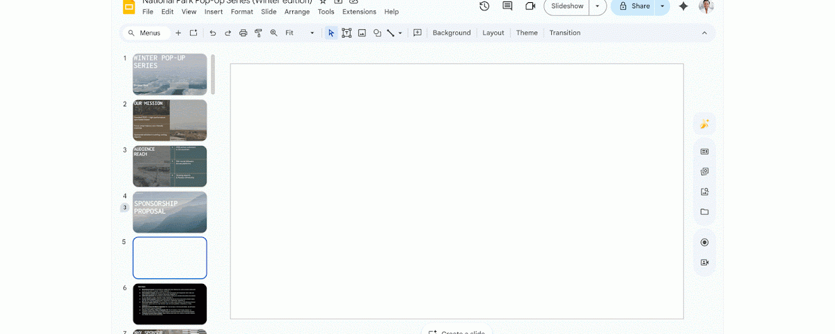 Abril 1, 2026La generación de diapositivas acaba de recibir una importante actualización. Gemini ahora puede crear diapositivas totalmente editables y de marca utilizando diseños dinámicos adaptados a su contenido específico. Para garantizar la coherencia visual, Gemini analiza de forma segura su plataforma existente para generar diseños que se ajusten a su estilo establecido. También puede hacer referencia manualmente a archivos específicos para contenido o estilo o permitir que Gemini muestre automáticamente archivos relevantes desde su Google Drive. Además, los usuarios ahora pueden editar diapositivas existentes para cambiar diseños y elementos de diseño o contenido. Simplemente haga clic en “Crear” o “Mejorar esta diapositiva” para comenzar.