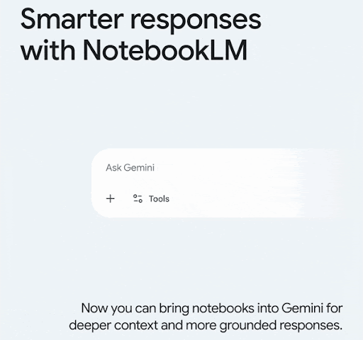 Enero 27, 2026A partir de hoy, los usuarios de Workspace ahora pueden agregar cuadernos desde NotebookLM como fuente en la aplicación Gemini. Esto proporcionará respuestas más profundas y relevantes que se basan en las fuentes de su cuaderno. Esta funcionalidad ya está disponible para los consumidores y nos complace compartir que ahora se está expandiendo a usuarios empresariales y educativos de todas las edades.