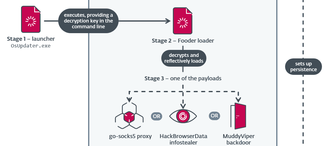 - Presentamos un análisis técnico de las herramientas utilizadas en esta campaña, incluyendo el backdoor MuddyViper, el loader Fooder, los credential stealers CE-Notes y LP-Notes, el browser data stealer Blub y los reverse tunnels implementados con go-socks5.