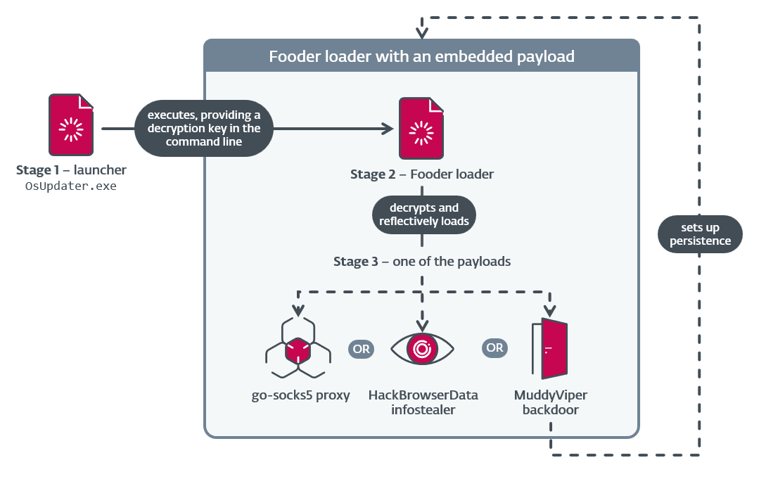 Fooder es un loader C/C++ de 64 bits diseñado para desencriptar y luego cargar reflexivamente la carga útil incrustada (como se ilustra en la Figura 1), siendo MuddyViper la carga útil observada con mayor frecuencia.