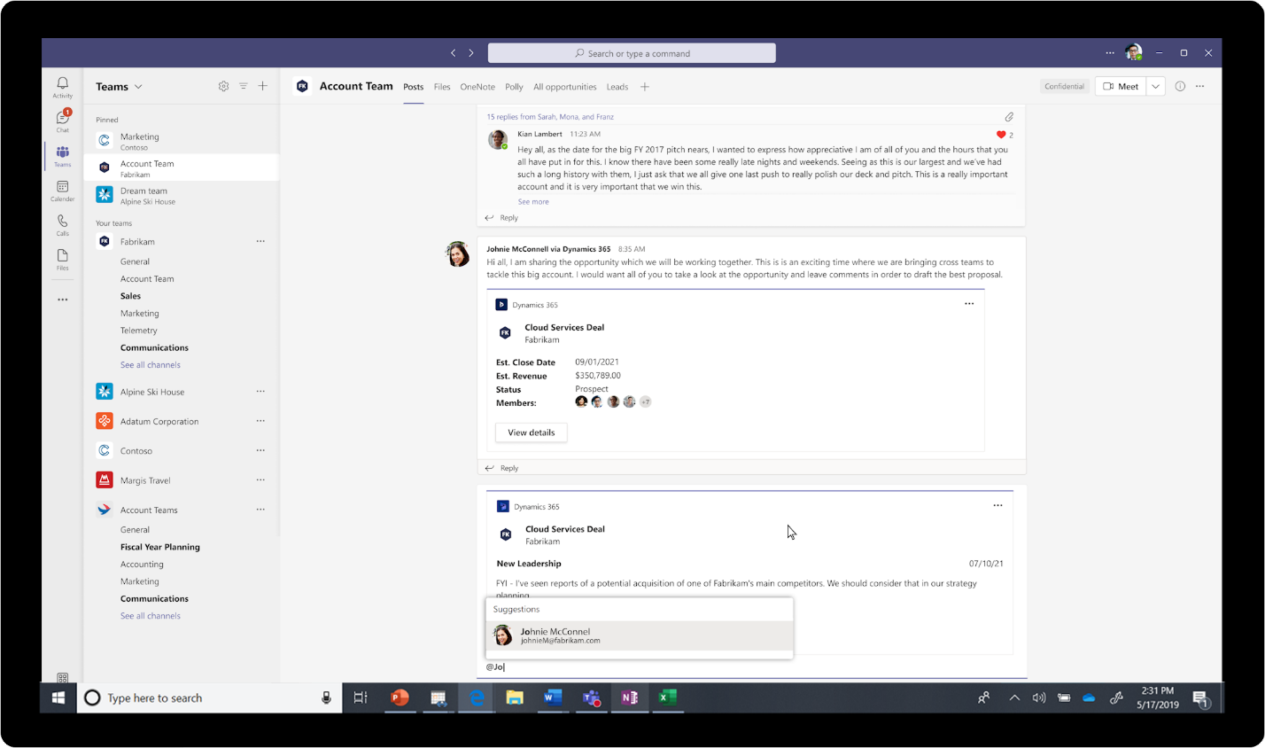Nuestras nuevas experiencias integradas entre Teams y Dynamics 365 son solo un ejemplo de una aplicación colaborativa. Hoy también se ha anunciado una serie de aplicaciones colaborativas nuevas y mejoradas de partners fabricantes de software independiente (ISV) líderes del mercado como Atlassian Confluence, SAP Sales Cloud, Salesforce, ServiceNow y Workday. Todas estas integraciones combinan procesos empresariales estructurados y datos en el contexto del trabajo colaborativo.