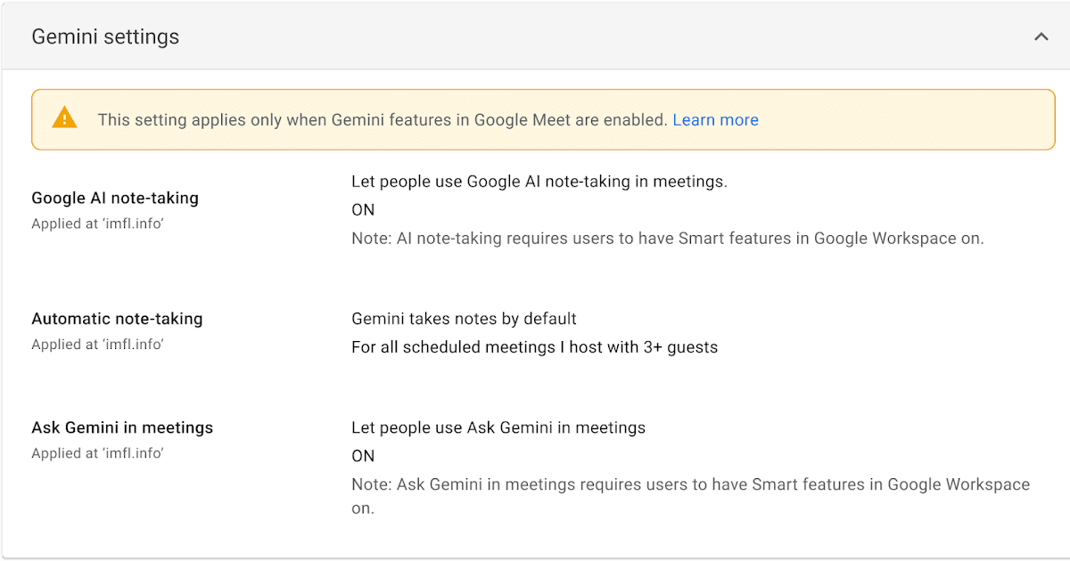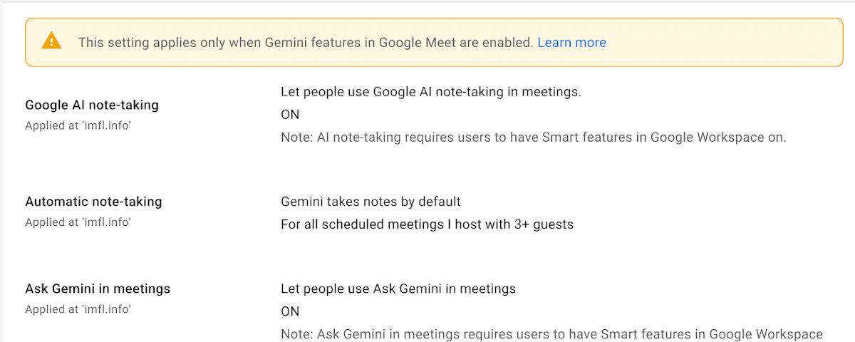 - Administradores: Esta nueva configuración estará activada de forma predeterminada para las organizaciones en Gemini Alpha a partir del 11 de marzo. Los administradores pueden optar por no participar en esta experiencia a partir de ahora yendo a la Consola de administración de Google Meet, yendo a la configuración de Gemini y ajustando el valor en “Toma automática de notas” a “DESACTIVADO”.