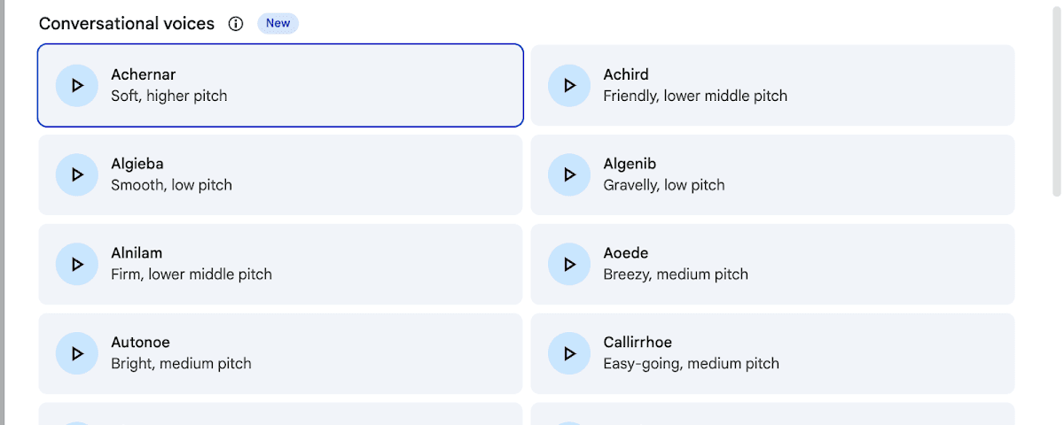 Opciones de voz conversacional disponibles en las locuciones de Google Vids |