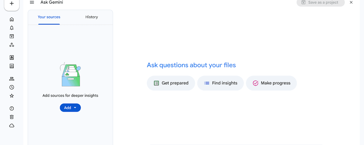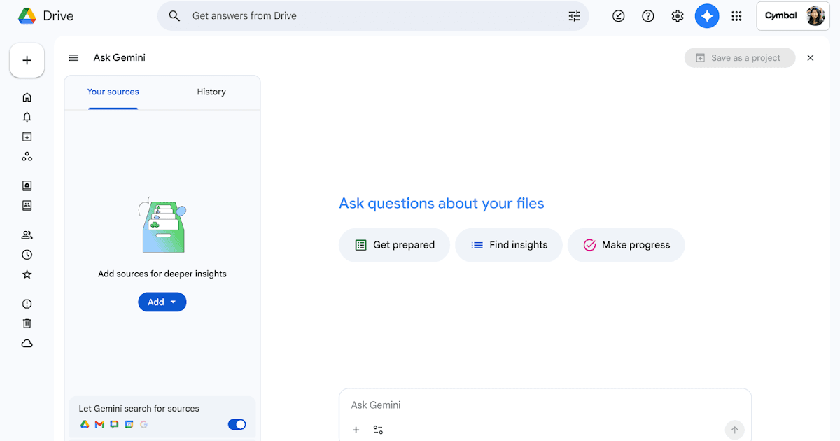 Google Drive no es sólo un lugar para almacenar tu trabajo, ahora es el lugar para entenderlo. Hemos reinventado la experiencia con Gemini, que ahora ofrece un espacio de trabajo dedicado e inmersivo diseñado para una concentración profunda. Ahora puede participar en conversaciones de alto contexto y de varios turnos para explorar y comprender de manera eficiente el contenido en Drive, las aplicaciones de Workspace y la Web.