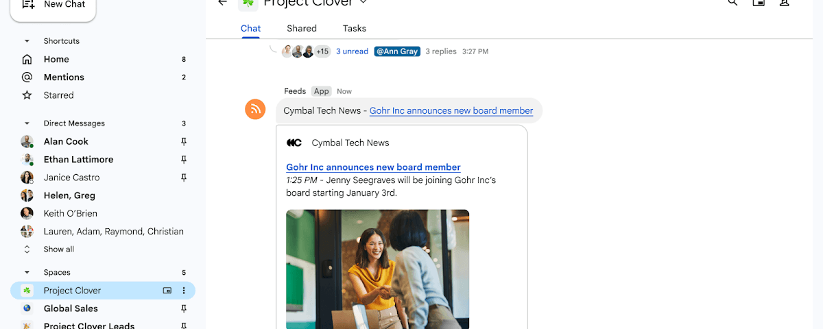Diciembre 17, 2025Estamos emocionados de presentar el nuevo Aplicación de feeds para chat de Google. Esta aplicación facilita que los equipos traigan actualizaciones externas importantes en tiempo real, como noticias, publicaciones de blogs e investigaciones de la industria desde cualquier fuente Atom o RSS, directamente a sus conversaciones y espacios grupales.