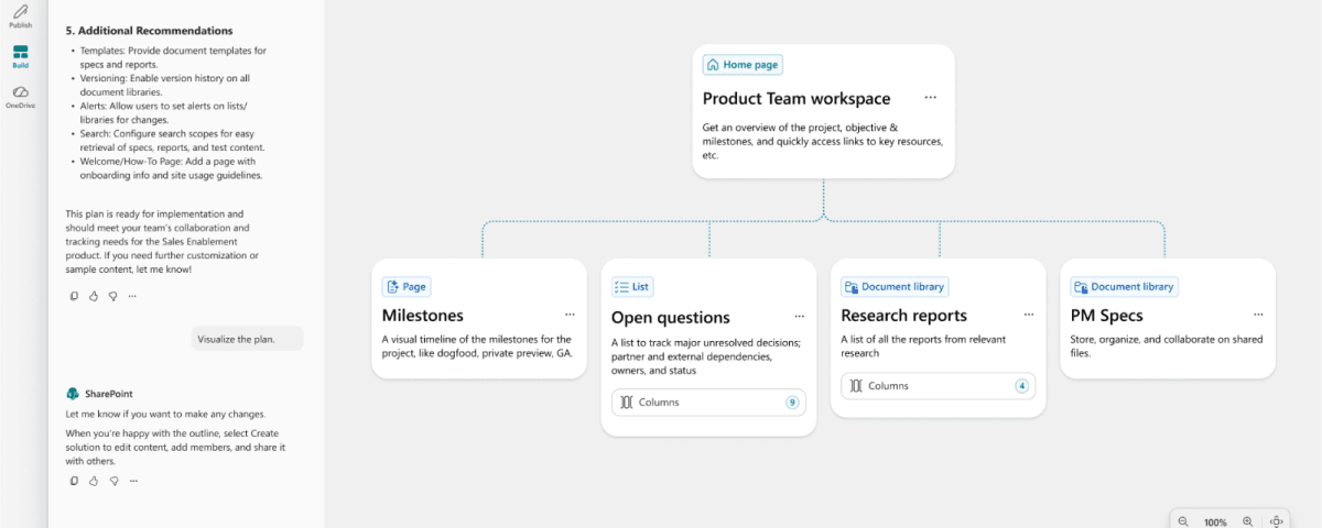 New agentic experiences in SharePoint allow teams to plan, create, and iterate on solutions collaboratively with support from AI. Rather than a one-time prompt, this enables teams to build end-to-end solutions for critical business needs, ranging from procurement contract repositories to IT helpdesks to marketing content management, all at scale, governed within the trusted SharePoint and Microsoft 365 environment.
