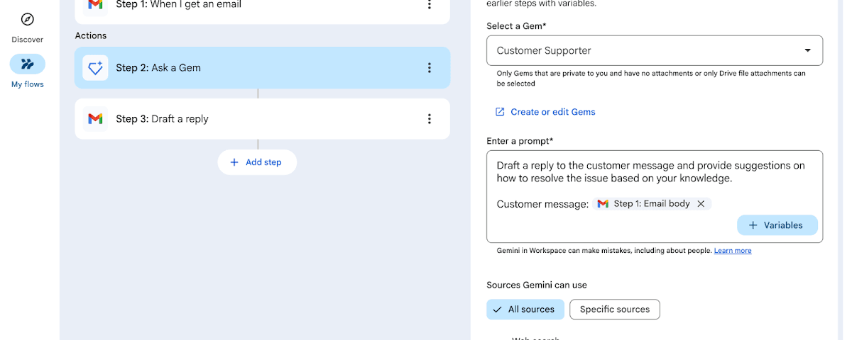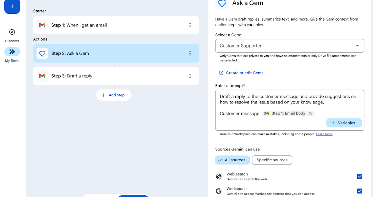Abril 22, 2026Estamos integrando Gems en Estudio de espacio de trabajo de Google como un paso que puedes agregar a tus flujos.